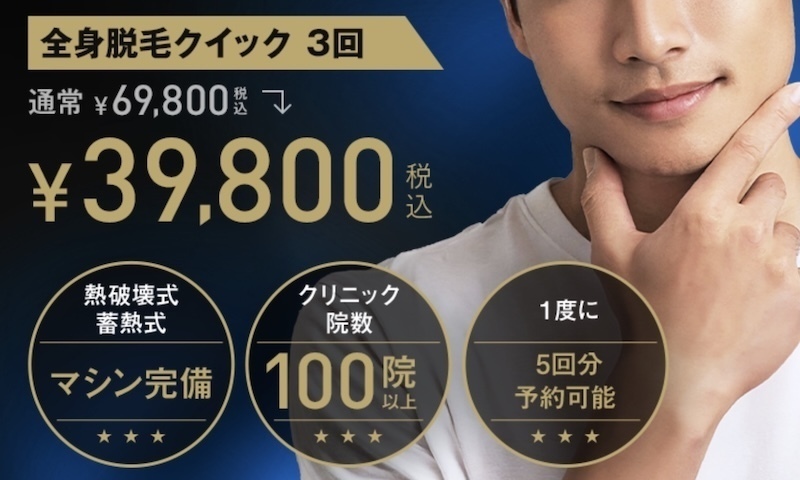 全身クイック脱毛が3回69,800円のところ、キャンペーンで39,800円と大特価。VIOは施術対象外なので注意。